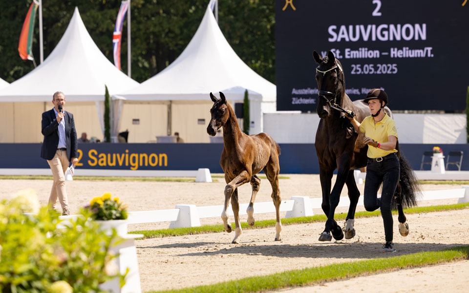The premiere of the Verden Champion Auction was a glittering highlight of the World Championships for Young Dressage Horses. Eleven foals with excellent dressage pedigrees were presented in the glorious evening sun after the final of the six-year-olds and aroused great interest. The St. Emilion/Helium son Sauvignon (breeder and exhibitor: Lena Thoenis, Hanstedt) found a new owner for 60,000 euros. The powerful black stallion is a grandson of the Christ daughter Calimera, who shone in the family competition at the Herwart von der Decken Show on Monday.